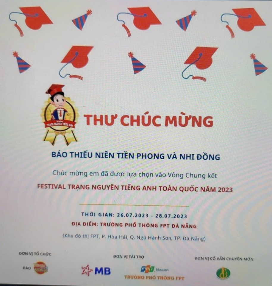em Lương Bảo Long - học sinh lớp 4A3 đã xuất sắc vượt qua hàng nghìn thí sinh lọt vào vòng Chung kết cuộc thi " Festival Trạng nguyên Tiếng Anh toàn quốc năm 2023" được tổ chức tại Đà Nẵng vào đầu tháng 8/2023
