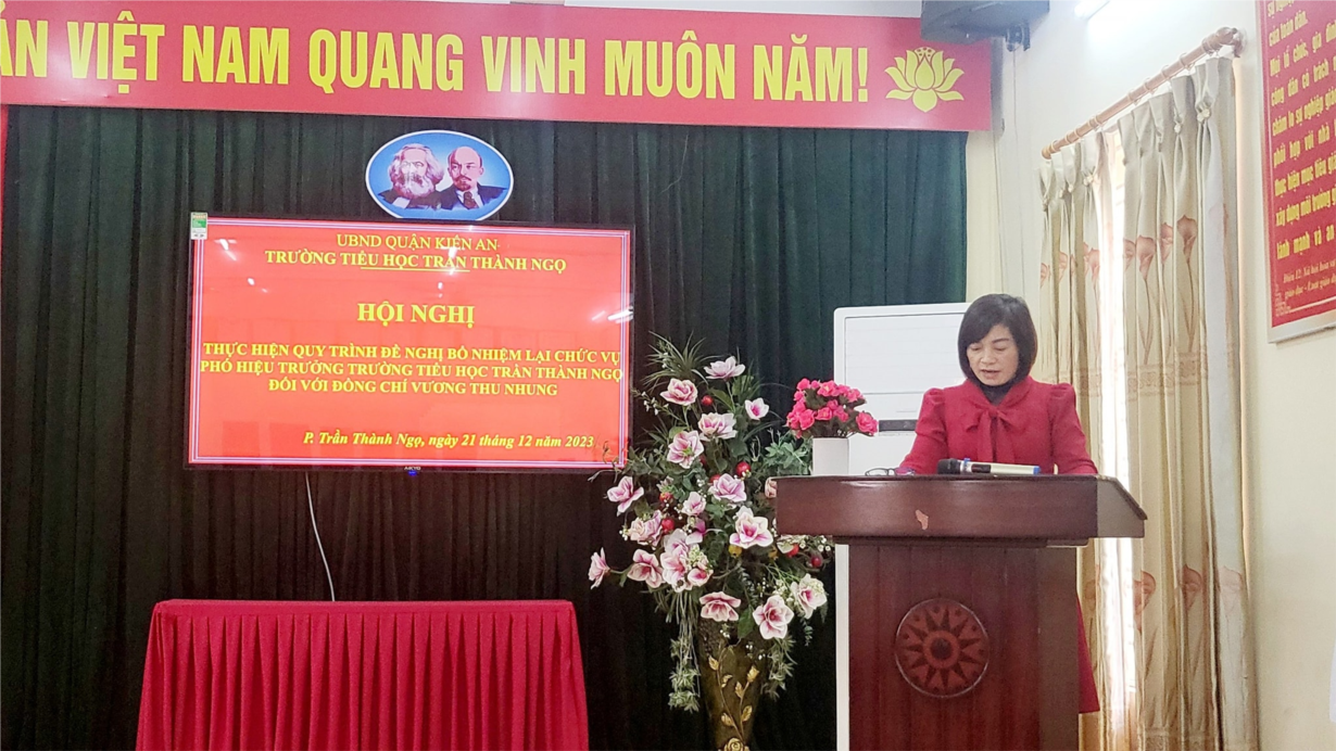 Đ/c Phạm Thị Hải An- Bí thư chi bộ, Hiệu trưởng trường Tiểu học Trần Thành Ngọ chủ trì Hội nghị: Trình bày toàn văn Thông báo số 102-TB/BTCQU của Ban Tổ chức Quận ủy ngày 16/11/2023 “Về việc thực hiện quy trình bổ nhiệm lại chức vụ Phó Hiệu trưởng Trường Tiểu học Trần Thành Ngọ, quận Kiến An” và Quán triệt mục đích, yêu cầu, phổ biến các quy định về công tác bổ nhiệm lại chức vụ đối với cán bộ.