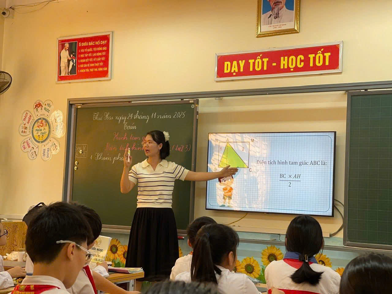 Tiết dạy minh họa bài: “Hình tam giác - Diện tích hình tam giác” (tiết 3) do cô giáo Đoàn Thị Vui cùng các em học sinh lớp 5A1 thực hiện đã mang đến một giờ học có tính định hướng rõ rệt, đảm bảo mục tiêu đổi mới phương pháp dạy học theo Chương trình GDPT 2018.
