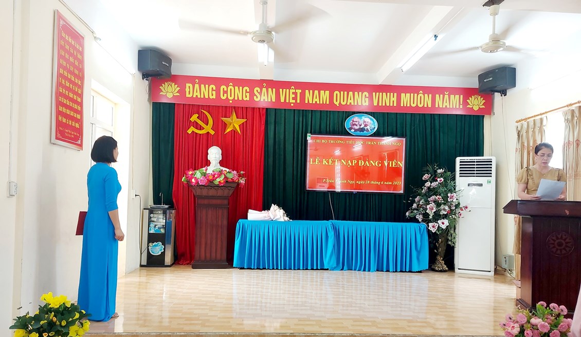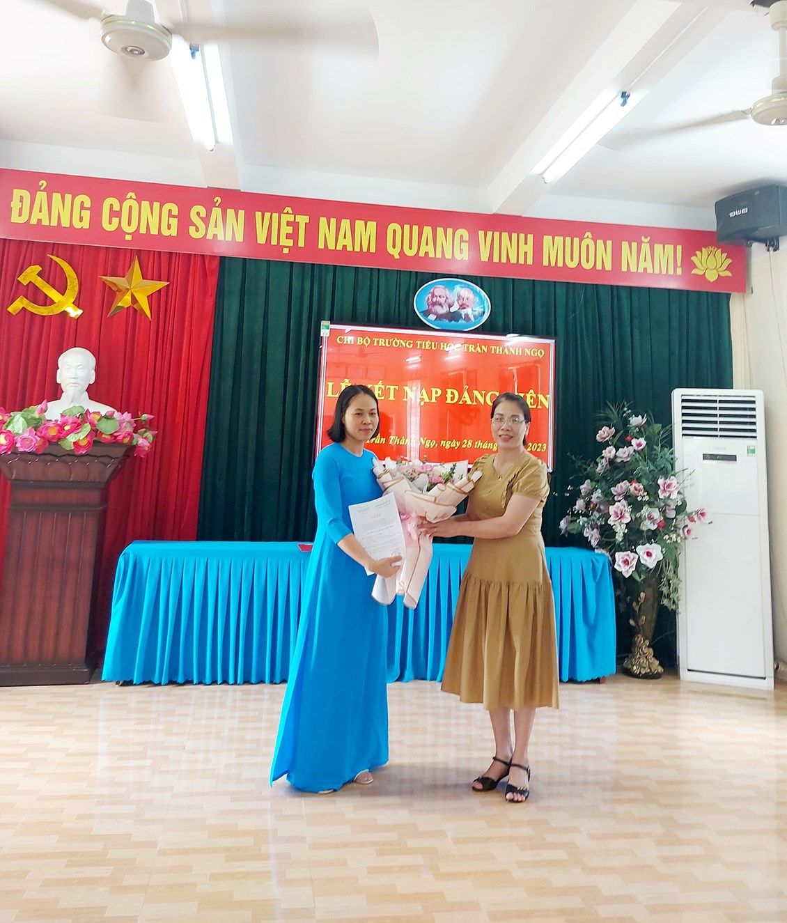 Thực hiện Nghị quyết Đại hội Chi bộ trường Tiểu học Trần Thành Ngọ về việc phát triển Đảng viên, chiều ngày 28/6/2023, Chi bộ trường Tiểu học Trần Thành Ngọ long trọng tổ chức Lễ kết nạp Đảng viên mới đối với quần chúng ưu tú Vũ Thị Tuyết. Đây là sự kiện có ý nghĩa quan trọng trong công tác xây dựng Đảng, góp phần phát triển, nâng cao chất lượng và sức chiến đấu của Chi bộ trường nói chung và các cá nhân Đảng viên nói riêng.