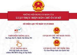 Ngày 10 tháng 11 năm 2022, Quốc hội ban hành Luật Thực hiện dân chủ ở cơ sở số 10/2022/QH15 gồm có 6 Chương và 91 Điều. Theo đó, Luật Thực hiện dân chủ ở cơ sở quy định một số nội dung đáng lưu ý như sau: