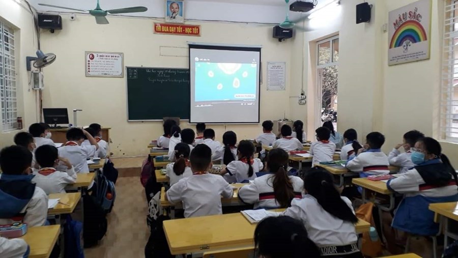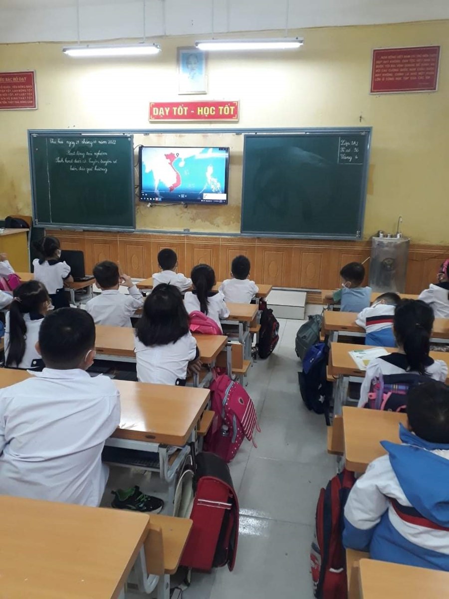 Các bạn học sinh đang xem video Bảo vệ chủ quyền biển đảo của Việt Nam.