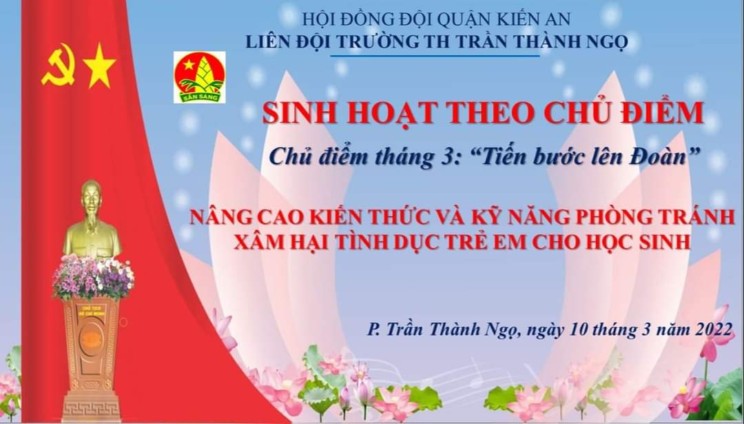 Với tình hình thực tế trong thời gian gần đây xảy ra ngày càng nhiều các vụ việcxâm hại tình dục trẻ em gây bức xúc dư luận và hoang mang cho các bậc phụ huynh vì thế Liên đội trường TH Trần Thành Ngọ tổ chức buổi sinh hoạt chuyên đề "Nâng cao kiến thức và kỹ năng phòng tránh xâm hại tình dục trẻ em" cho HS toàn trường với điểm cầu trung tâm là Hội trường kết nối trực tuyến với 32 lớp học.